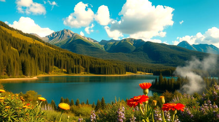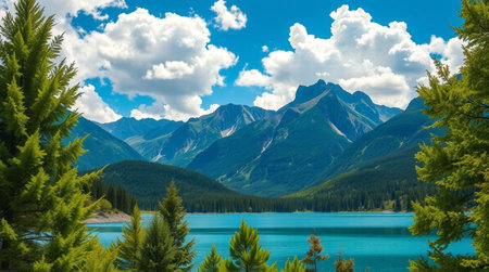 Beautiful alpine lake with clear water and white clouds on blue sky