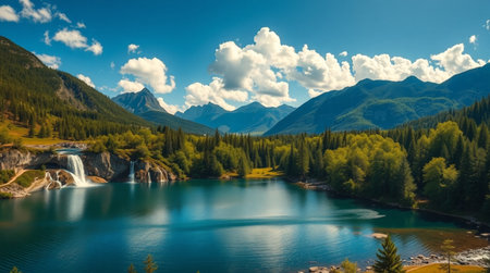 A reflective lake shows flawless details of nearby forest trees and an elegant waterfall.