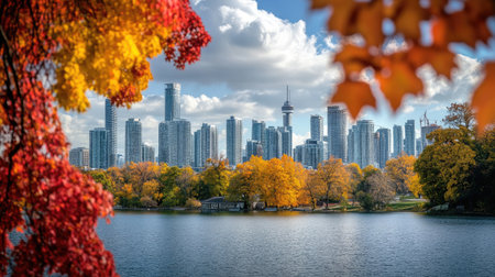 A vibrant skyline framed by colorful autumn foliage, showcasing the beauty of nature alongside urban life.