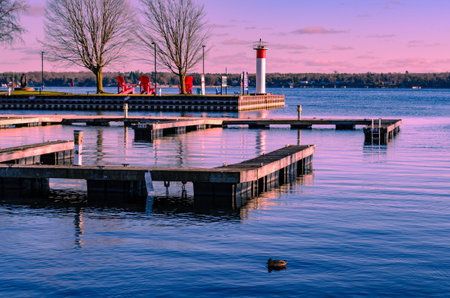 Early evening view of empty boat slips and a lighthouse beacon against a pink sky in early winter