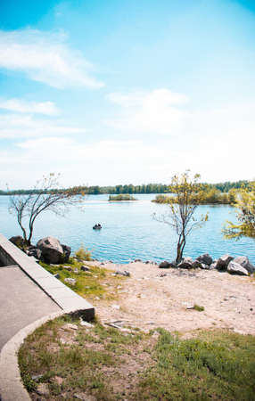 Promenade on the shore of lake Ontario with stones in front and a beautiful blue sky and white clouds in Burlington Ontario.