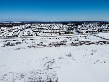Aerial of the Kanata neighborhood in winter. Suburbian houses next to a large area covered with snow. Kanata, Ottawa, Ontario, Canada.