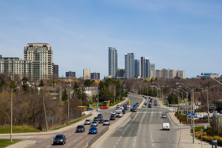 TORONTO, CANADA - 28TH APRIL 2014 A high view showing traffic along Sheppard Avenue and Modern Condos in the background in uptown Toronto