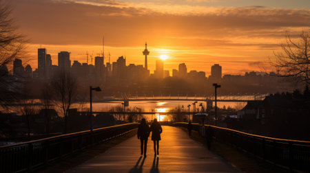 Two people walking on a bridge with the sun setting in the background. Generative AI image.