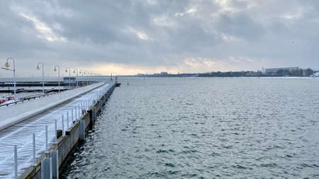 The frozen pier at the entrance of the Thornbury Yacht Club marina in the winter. Large ice sickles hang down from the shoreline after winter storms pack ice around the beach