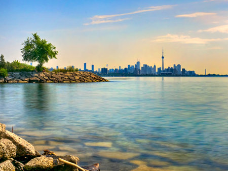 Panorama of Toronto at sunset with CN Tower over Ontario Lake, Canada