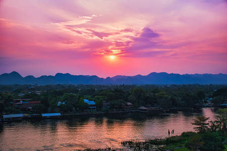Beautiful glowing pink sunset over the River Kwai in Kanchanaburi