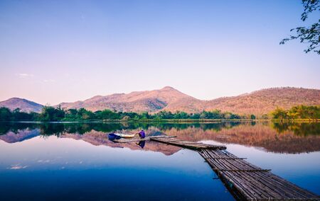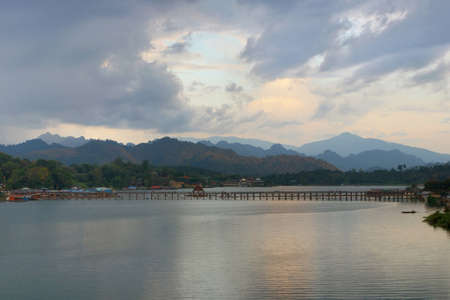Village antique landmark with bridge wooden traditional culture in dam at sangkhlaburi,kanchanaburi,thailand