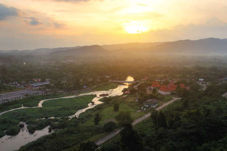 Beautiful nature landscape of mountain range with sunrise sky and clouds. City in mountain valley in Thailand. Scenery of mountain layer with morning sunrise. Tropical forest. Nature background.