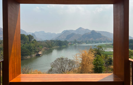 Beautiful landscape view of river and mountain from the wooden window frame.