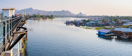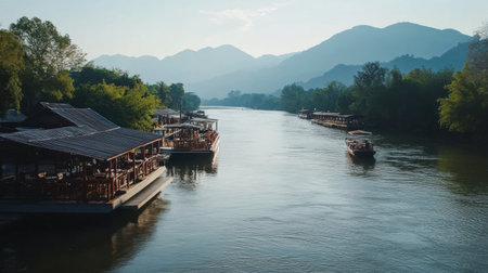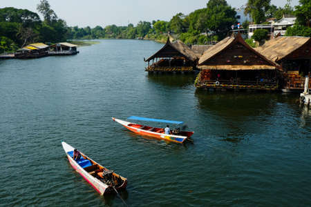 Kanchanaburi, Thailand - 23 01 2019 - Beautiful Kwai River landscape with boats and floating restaurants in Kanchanaburi.