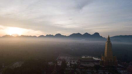 Aerial photo of Beautiful temples in the morning atmosphere , Thailand .