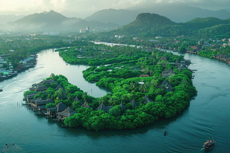 An aerial view showcasing a large, beautifully designed riverside complex with traditional Thai architecture, surrounded by a winding river, and a modern bridge connecting nearby communities.