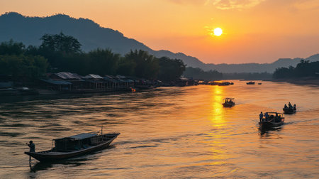 Beautiful sunset over a tranquil river, creating stunning reflections and highlighting lush hills. Ideal for nature, travel, and landscape themes.