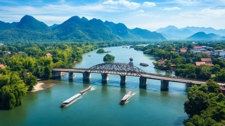 A stunning aerial view of the River Kwai Bridge, with boats traveling underneath and mountains in the distance.