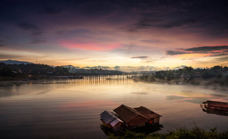 floating house in river at Sangkhlaburi District, Kanchanaburi Thailand in the morning