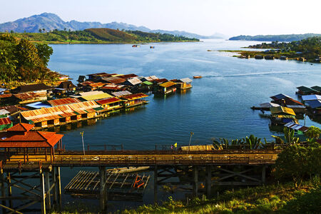 Sangkhlaburi - March 05, 2017: The scenery of floating village and a part of temporary bamboo bridge the river in Sangkhlaburi District, Thailand, in the early morning.