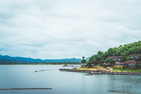 Srinagarind Dam with cloudy sky and bungalow at kanchanaburi ,Thailand