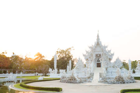 Beautiful buddhist Wat Rong Khun white temple in Chiang Rai in northern Thailand. Cityscape with beautiful religion architecture in south east Asia.