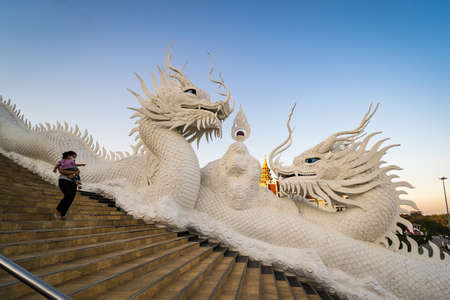 Chiang Rai, Thailand - January, 09, 2022 : Beautiful White Dragon statue at Wat Huay Pla Kang Buddhist Temple. Landmark of Chiang Rai. Located in Thailand.