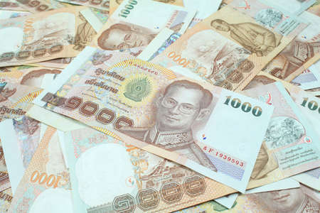 One thousand baht banknotes put on the isolated white background that represent the King Rama IX and the most value of banknote of Thailand.