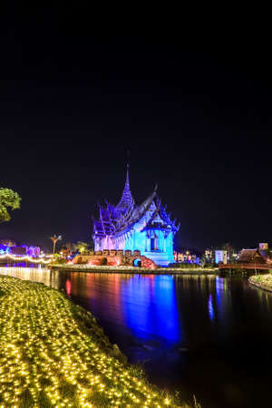 Ancient Siam,Samut Prakan,Thailand on April 3,2021:Beautiful illuminations at central zone of Ancient city during MUANGBORAN LIGHT FEST