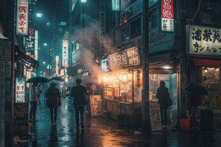 Visitors explore a vibrant night market in the heart of the city, enjoying street food and atmosphere under umbrellas as rain falls. Neon signs illuminate the wet streets. AI Generated