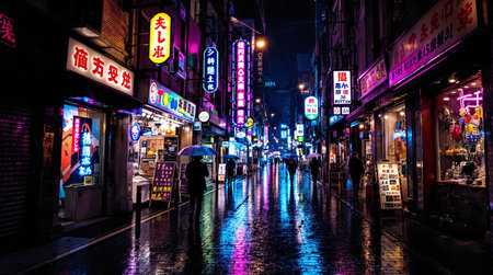 Vibrant nightlife in a bustling urban street with neon lights and reflections.