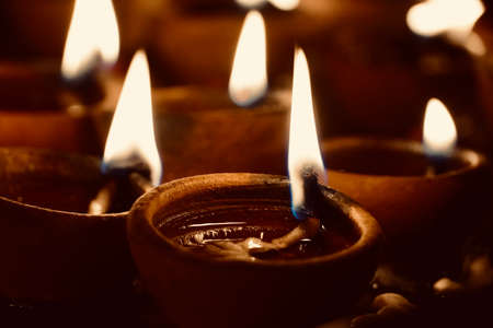 Happy Diwali - Colorful clay diya lamps lit during diwali celebration