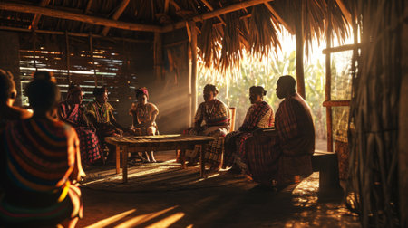 The gathering of an Indigenous council discussing matters of governance and community well-being. Generative AI