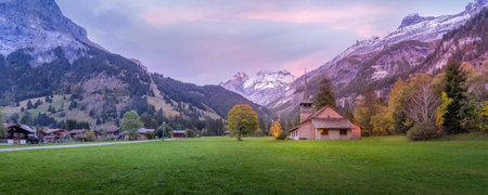 St. Mary Church, Kandersteg, Canton of Bern, Switzerland, Europe, autumn trees and sunset snow mountains panoramic banner