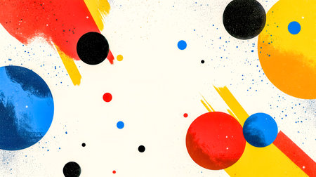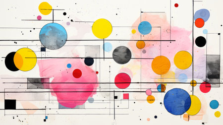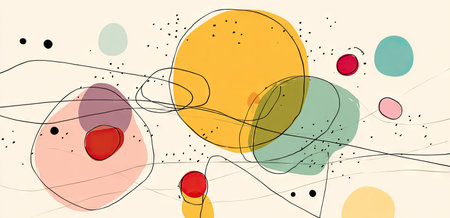 An abstract illustration presents a collection of colorful shapes including circles and organic forms, complemented by fine black lines. The composition features a palette of yellow, red, blue, and pink against a light background. This design is suitable for use in various commercial contexts, offering a versatile visual element.