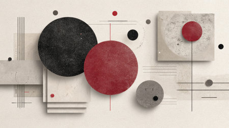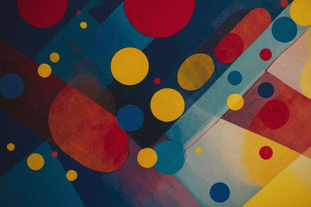 Vibrant abstract geometric design showcasing a balanced arrangement of colorful circles and rectangles with dynamic lines, against a textured backdrop.