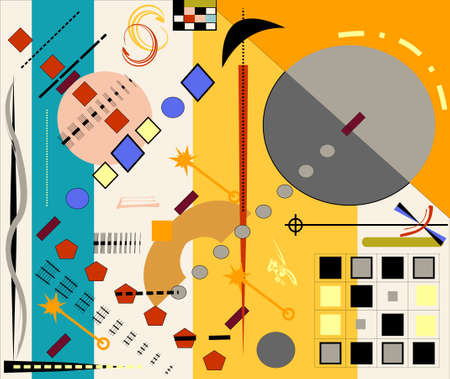 Abstract geometric shapes with colored circles, squares, lines and rectangles on white background. Drawing.