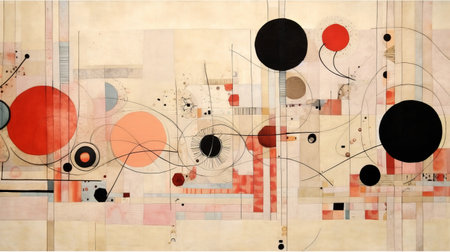 abstract painting featuring black, red, and white circles created for the john gillespie show. the artwork showcases a unique blend of light orange and light beige, incorporating elements inspired by scientific diagrams, kinetic lines and curves, as well as cubist fragmentation of space. this large-scale mural combines delicate ink lines with revived historic art forms, resulting in a visually captivating composition. ai generated