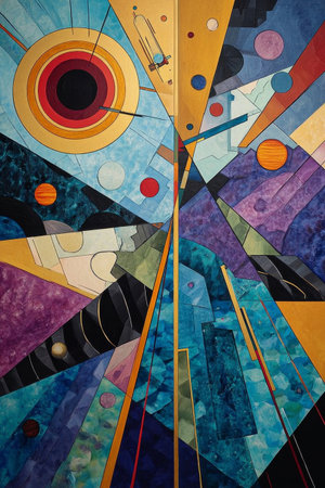 A dynamic abstract painting featuring geometric shapes, bright yellows, deep blues, and purples. A celestial theme with planets adds mystery and depth.