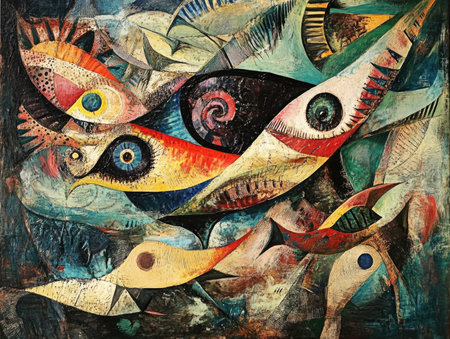 Abstract Colorful Fish Painting with Surreal Eye Patterns and Dynamic Shapes.