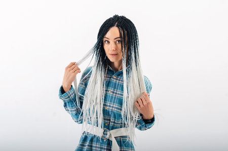 Creative dreadlock hairstyle. Portrait of graceful woman with white afro braids in checkered shirt.. White background.