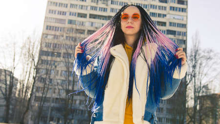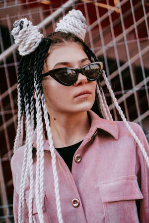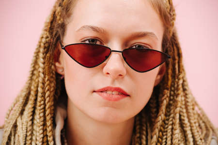 A closeup portrait of a stylish hipster woman with fancy pink sunglasses and micro braids hairstyle posing outdoors