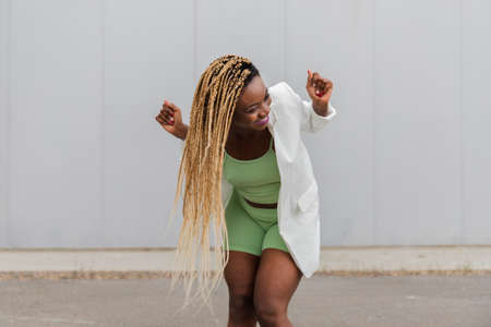 Happy smiling young african american woman dancing in the street. Long blond braided hair. Happiness concept.