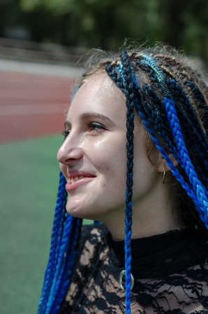 Portrait of a positive young adult woman with long blue dreadlocks. The happy female is laughing sincerely with a toothy smile outside. People, emotion. Selective focus.