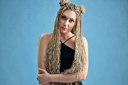 Caucasian model posing on a blue background standing right in front of the camera. Photo of a fashionable woman in a black blouse with long hair afro dreadlocks in a studio.
