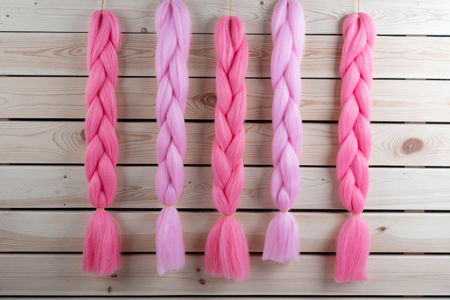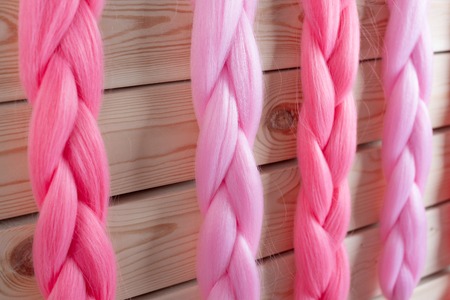 Kanekalon hangs on a wooden background of pink, fuchsia red in different shades similar