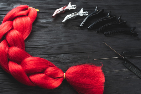 Kanekalon red material on black wooden background near clips