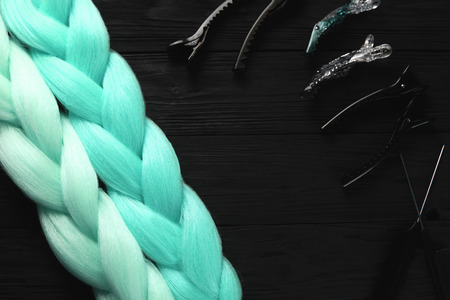 Kanekalon pair of turquoise material on a black wooden background close clips and combs