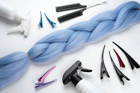 Kanekalon artificial hair of blue or cornflower blue color for braiding and Afro- hairstyles, lying on a white background next to accessories