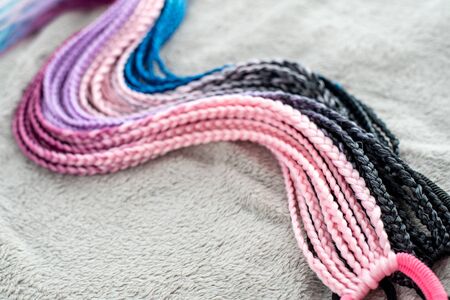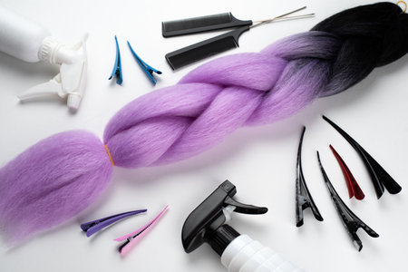 Kanekalon two- color-artificial hair purple and blue for braiding braids, lying on a white background next to accessories