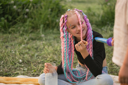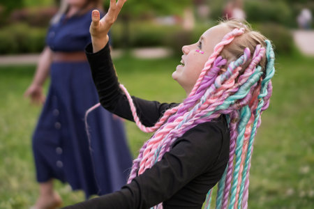 A Joyful Child with Colorful Braids is Enjoying Nature in a Bright and Cheerful Way