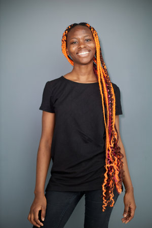 Pretty young afro-american woman with braids on the bright studio background, Generative AI