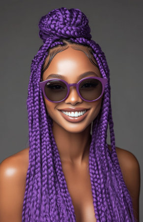 Stylish Black woman with long purple cornrows, intricate braids, trendy sunglasses, and a bright, joyful smile outdoors